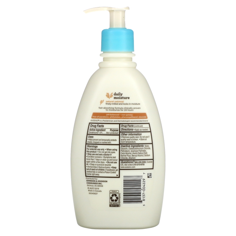 Ежедневный увлажняющий лосьон contains natural коллоидное овсяное толокно с богатыми смягчающими средствами для успокоения нежной, но сухой кожи вашего ребенка. Естественным образом питающий, не жирный состав быстро впитывается, увлажняет в течение целых 24 часов, не содержит иссушающих спиртов и не заибвает поры. Он гипоаллергенен и не имеет запаха, поэтому он не раздражает чувствительную кожу. Он достаточно мягок даже для младенцев.