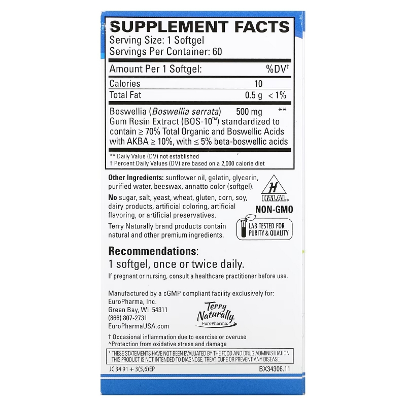 EuroPharma, Terry Naturally, BosMed 500, Экстра сила, Улучшенная босвелия, 500 мг, 60 мягких капсул – отзывы, купить с доставкой по Москве и России по цене выгоднее, чем в аптеке | интернет-магазин saratov.fakeoff.ru