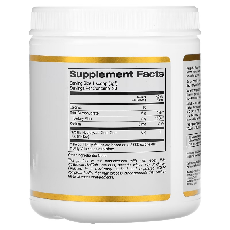 California Gold Nutrition Prebiotic Fiber contains Sunfiber® Guar Fiber in an unflavored powder that can easily be added to any drink.