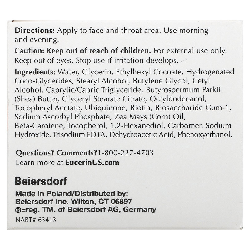 Крем для лица против морщин Eucerin Q10 помогает пополнять этот естественный фермент, который имеет жизненно важное значение для здоровой кожи. Вместе с витамином Е и бета-каротином, он также образует мощный антиоксидантный комплекс, который способен помочь защитить тело от вредного воздействия свободных радикалов.