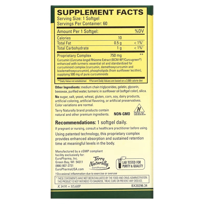 Proprietary Complex Curcumin (Curcuma longa) Micronized Rhizome Extract (BCM-95), phospholipids, turmeric essential oil, supplying 500 mg of pure curcuminoids |