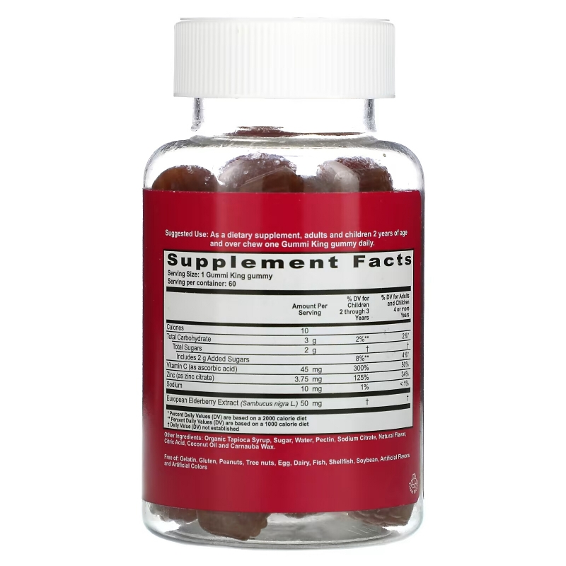 GummiKing™ Elderberry is specially formulated to strengthen, boost and maintain a strong immune system for kids. Made with superfood Elderberry, along with Vitamin C and Zinc, this unique gummy vitamin contains all the ingredients needed to keep the immune system healthy and promote overall health and wellness.
