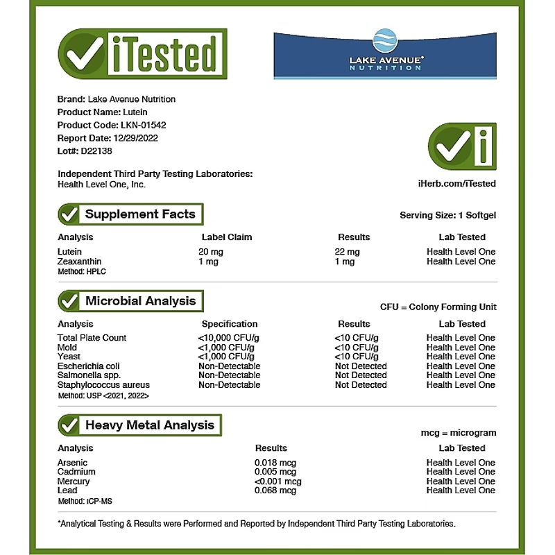 Описание добавки Lake Avenue Nutrition, Lutein, 20 mg, 120 Veggie Softgels