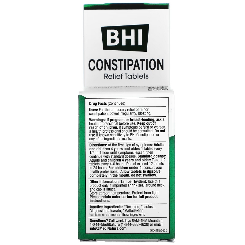 Перед применением во время беременности или кормления грудью следует проконсультироваться с медицинским работником. Хранить в недоступном для детей месте. Если симптомы сохраняются или ухудшаются, следует проконсультироваться с врачом. Не используйте, если у вас есть чувствительность к средству от запоров от BHI или любому из его ингредиентов.