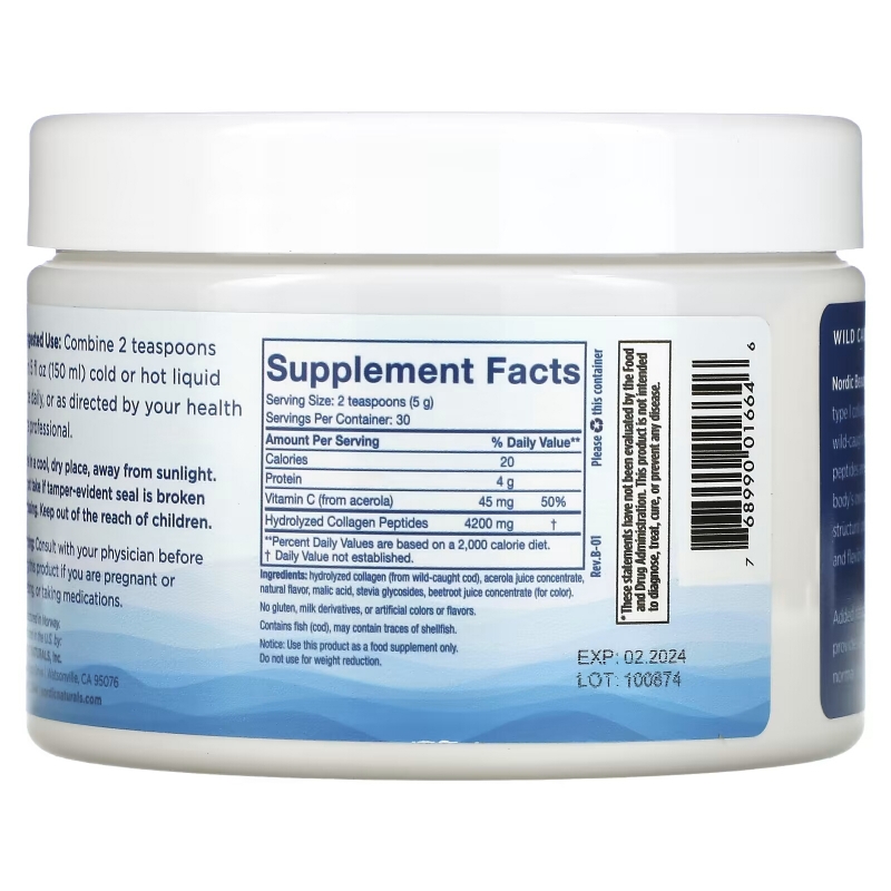 Nordic Naturals Marine collagen delivers bioactive type 1 collagen peptides from sustainable, wild-caught arctic cod. These small, hydrolyzed peptides are easily absorbed and help stimulate the body's own collagen-producing cells. Collagen is a structural protein that provides strength, elasticity, and flexibility to skin, joints, and bones. Added natural vitamin C from acerola fruit provides antioxidant support and aids in normal collagen formation. Nordic Naturals Marine Collagen has a mild strawberry taste and dissolves easily in warm or cold liquids.
