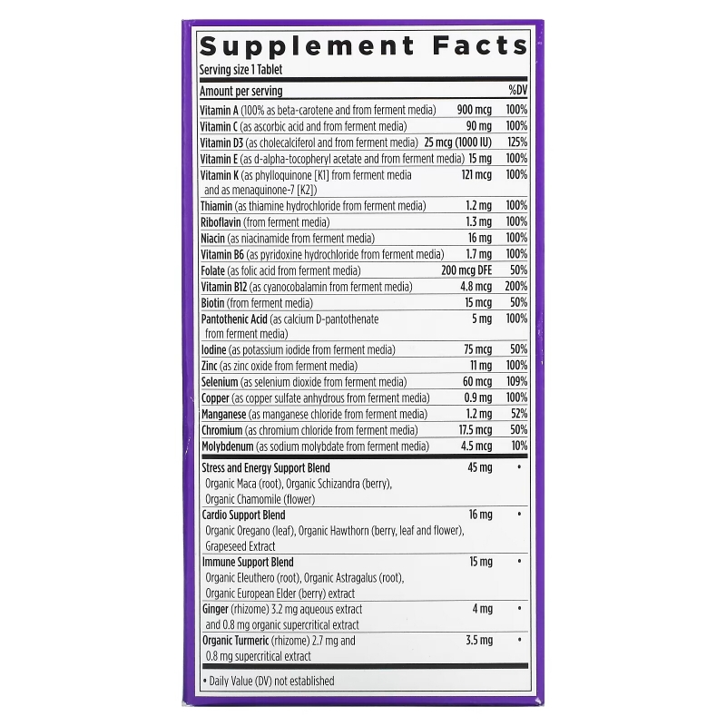 * Суточная доза не определена. ‡ Литотамнион: (L. calcareum и L. corallioides) Питательные вещества и травы культивируют в органических средах, которые могут содержать: органическую молотую сою, Saccharomyces cerevisiae (органические дрожжи: активные и неактивные), органический мальтодекстрин, органическую аравийскую камедь, органическую апельсиновую кожуру, органическую кожуру лимона, органический морковный порошок, органический порошок люцерны , Органическая меласса, Lactobacilli (L. acidophilus, L. bifidus, L. rhamnosus) и ферменты (дезактивированные). |