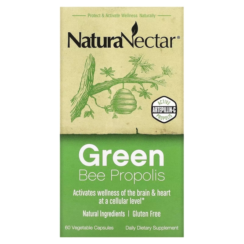 NaturaNectar, Абсолютно натуральный зеленый пчелиный прополис в капсулах, для здоровья мозга и сердца, 60 вегетарианских капсул