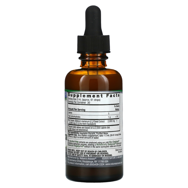 Описание добавки Nature's Answer, Расторопша, без спирта, 2000 мг, 2 жидких унции (60 мл)