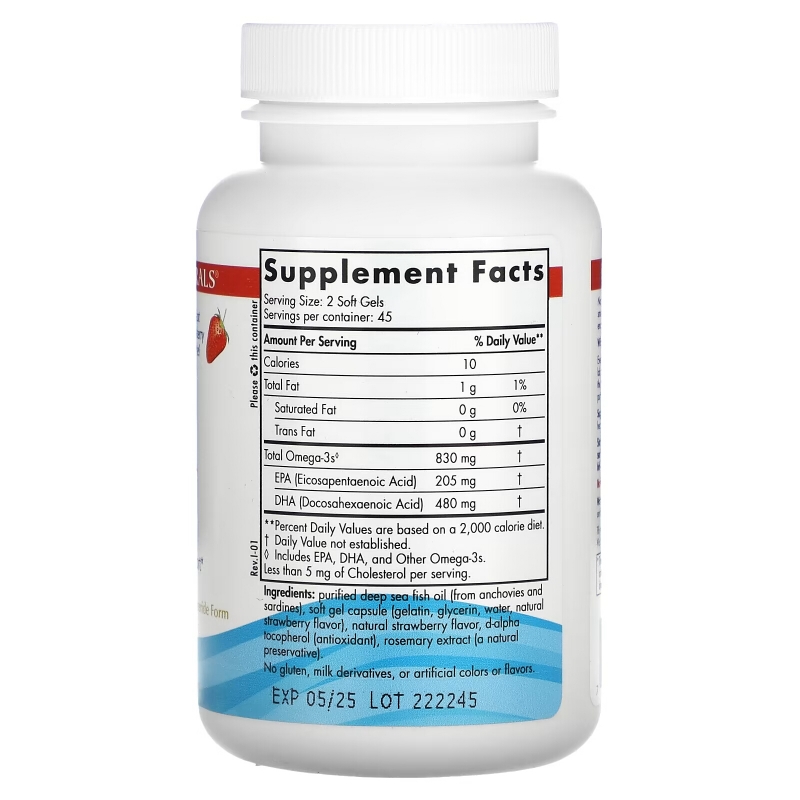Purified deep sea fish oil (from anchovies and sardines), soft gel capsule (gelatin, water, glycerin, natural strawberry flavor), natural strawberry flavor, d-alpha tocopherol, rosemary extract (a natural preservative).