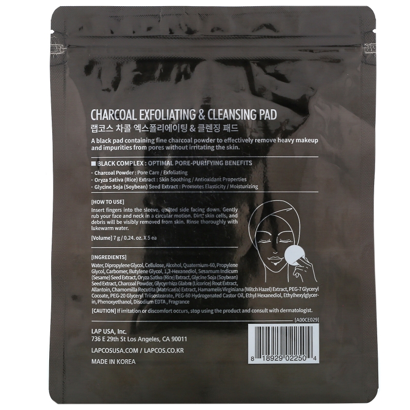 Описание добавки Lapcos, Отшелушивающие и очищающие диски с углем, 5 шт., 7 г (0,24 жидк. унции) каждый