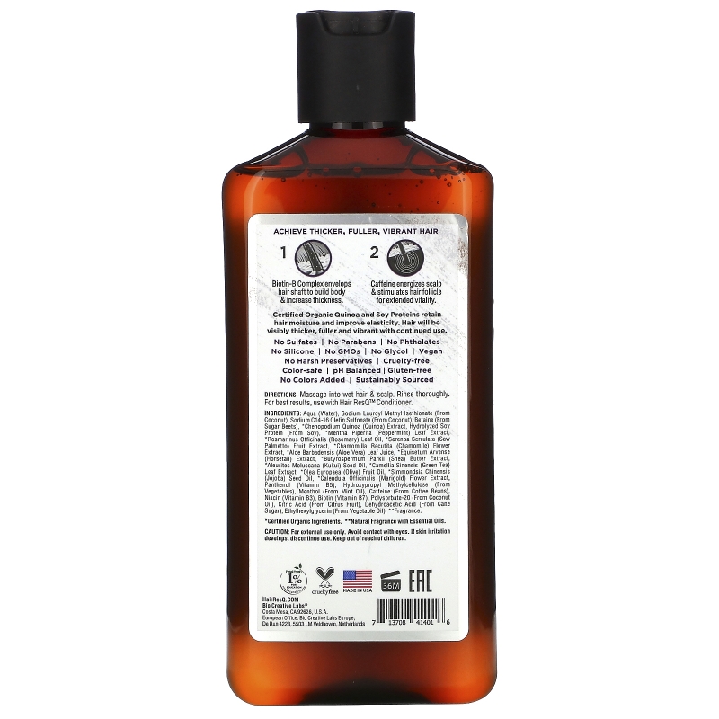 Aqua (water), sodium lauroyl methyl isethionate (from coconut), sodium C-14-16 olefin sulfonate (from coconut), betaine (from sugar beets), *chenopodium quinoa (quinoa) extract, hydrolyzed soy protein (from soy), *mentha piperita (peppermint) leaf extract, *rosmarinus officinalis (rosemary) leaf oil, *serenoa serrulata (saw palmetto) fruit extract, *chamomilla recutita (chamomille) flower extract, *aloe barbadensis (aloe vera) leaf juice, *equisetum arvense (horsetail) extract, *butyrospermum parkii (shea) butter extract, *aleurites moluccana (kukui) seed oil, *camelia sinensis (green tea) leaf extract, *olea europaea (olive) fruit oil, *simmondsia chinensis (jojoba) seed oil, *calendula officinalis (marigold) flower extract, panthenol (vitamin B5), hydroxypropyl, methylcellulose (from vegetables), menthol (from mint oil), caffeine (from coffee beans), niacin (vitamin B3), biotin (vitamin B7), polysorbate-20 (from coconut oil), citric acid (from citrus fruit), dehydroacetic acid (from cane sugar), ethylhexylglycerin (from vegetable oil), **fragrance.