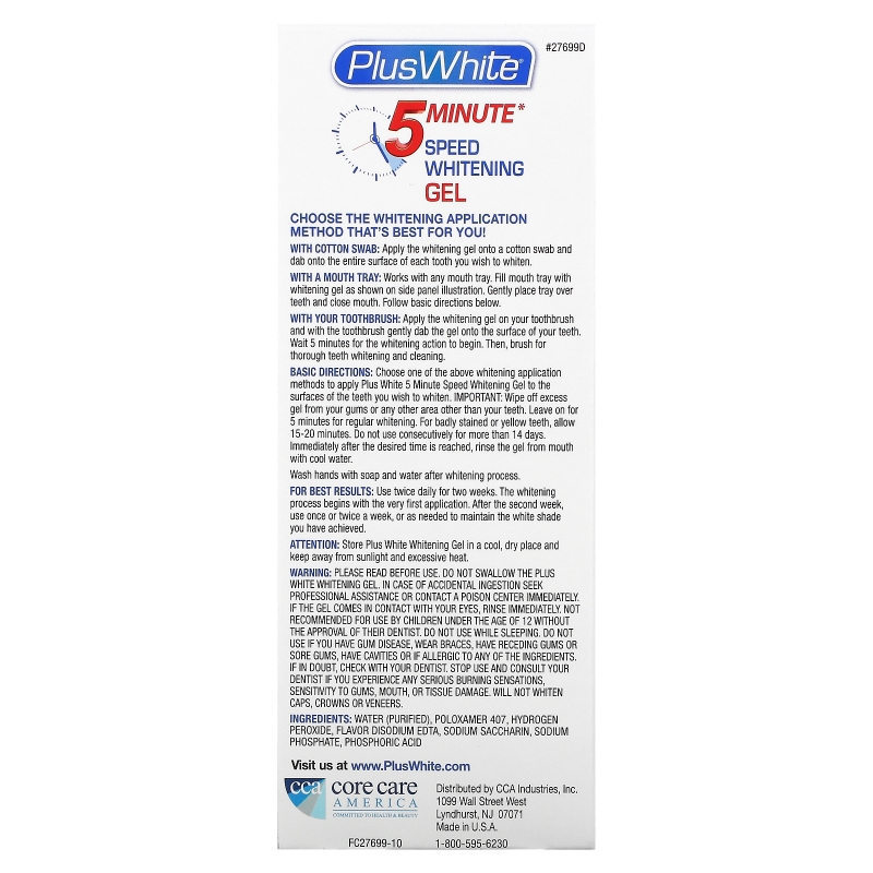Please read before use. Do not swallow the plus white whitening gel. In case of accidental ingestion seek professional assistance or contact a poison center immediately. If the gel comes in contact with your eyes, rinse immediately. Not recommended for use by children under the age of 12 without the approval of their dentist. Do not use while sleeping. Do not use if you have gum disease, wear braces, have receding gums or sore gums, have cavities or if allergic to any of the ingredients. If in doubt, check with your dentist. Stop use and consult your dentist if you experience any serious burning sensations, sensitivity to gums, mouth, or tissue damage. Will not whiten caps, crowns or veneers.