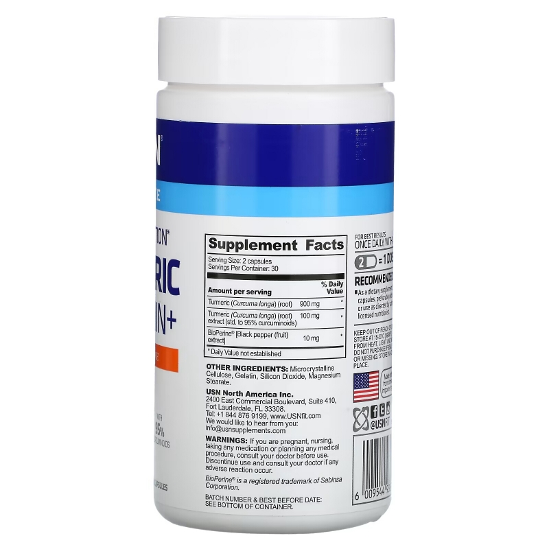 USN, легкоусвояемый куркумин с комплексом BioPerine, 500 мг, 60 капсул
